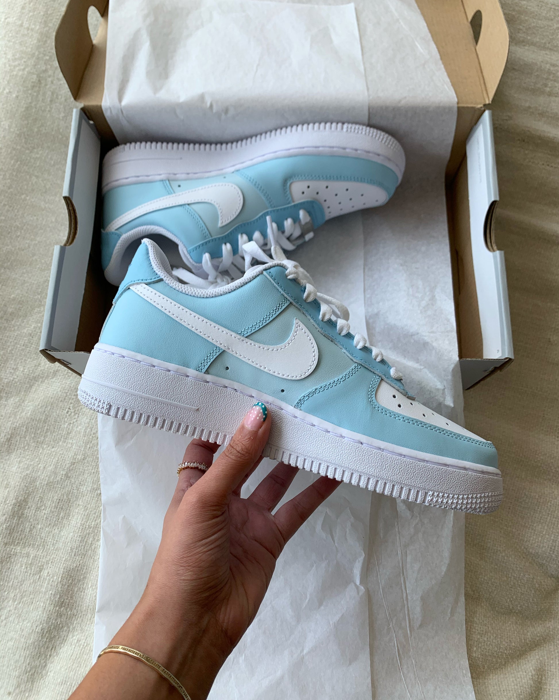 Nike Air force 1 - Powder Blue. All footwear has been hand painted for up to 7 hours using leather acrylic paint and finished with a matte finisher. Please wear with the same care this product has been crafted with. All footwear comes with crease protectors for the toe box of your shoes.