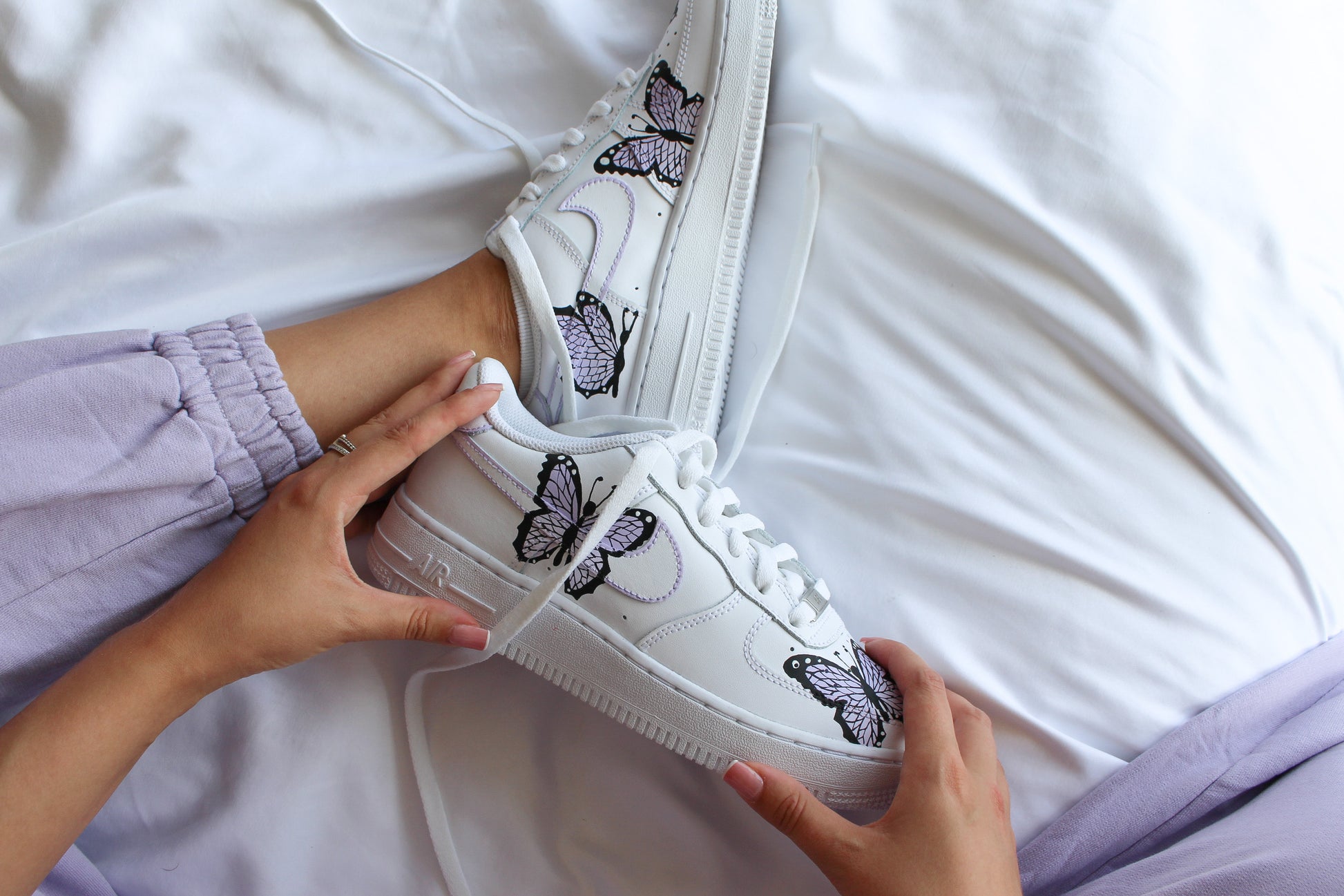 Nike Air force 1 Butterfly - Lilac. All footwear has been hand painted for up to 7 hours using leather acrylic paint and finished with a matte finisher. Please wear with the same care this product has been crafted with. All footwear comes with crease protectors for the toe box of your shoes.