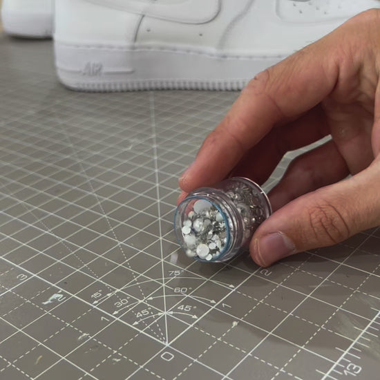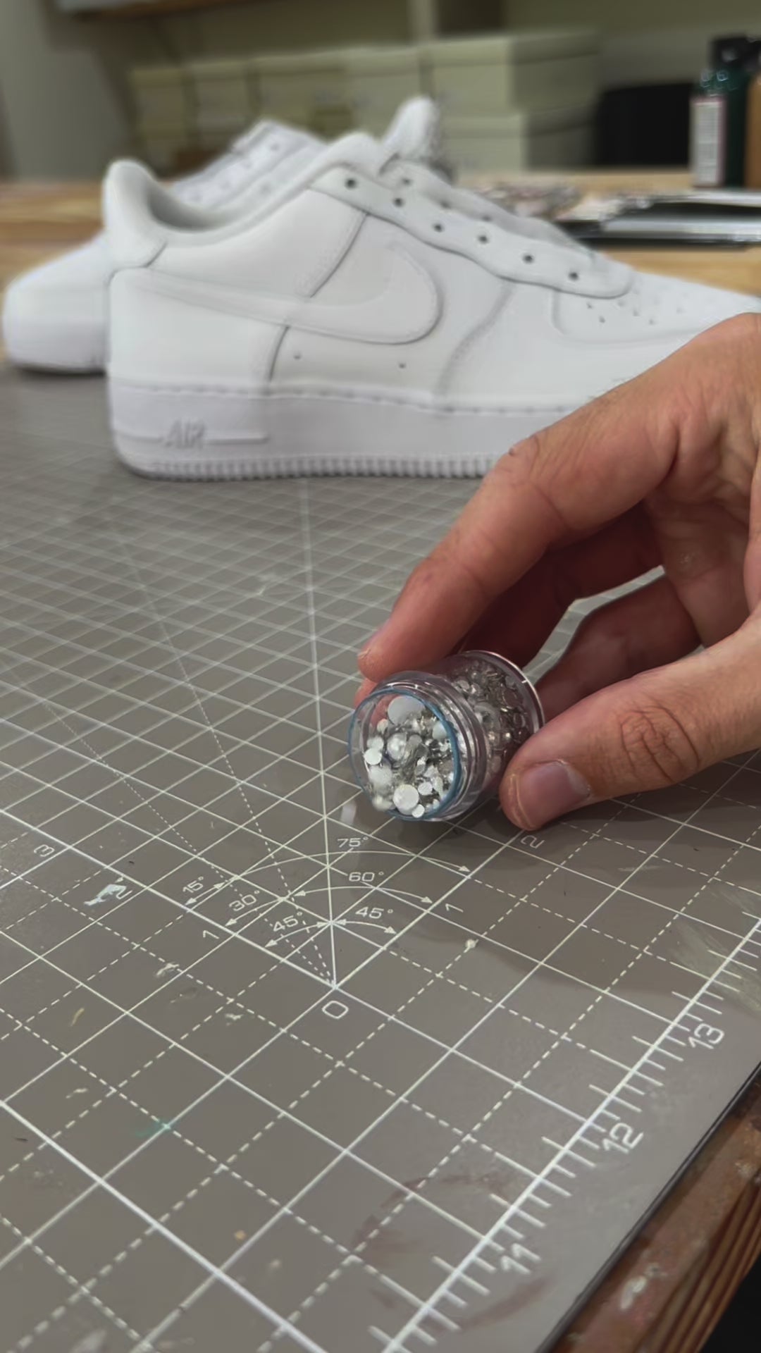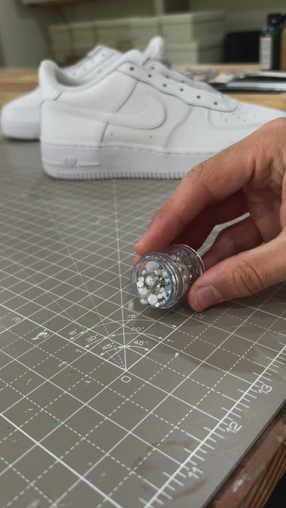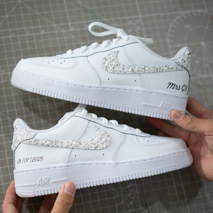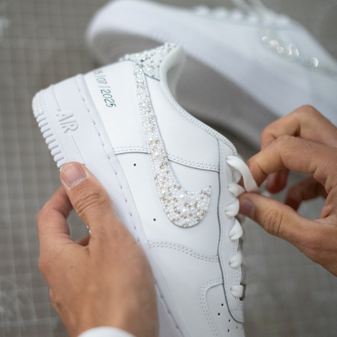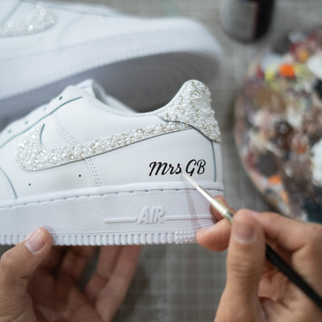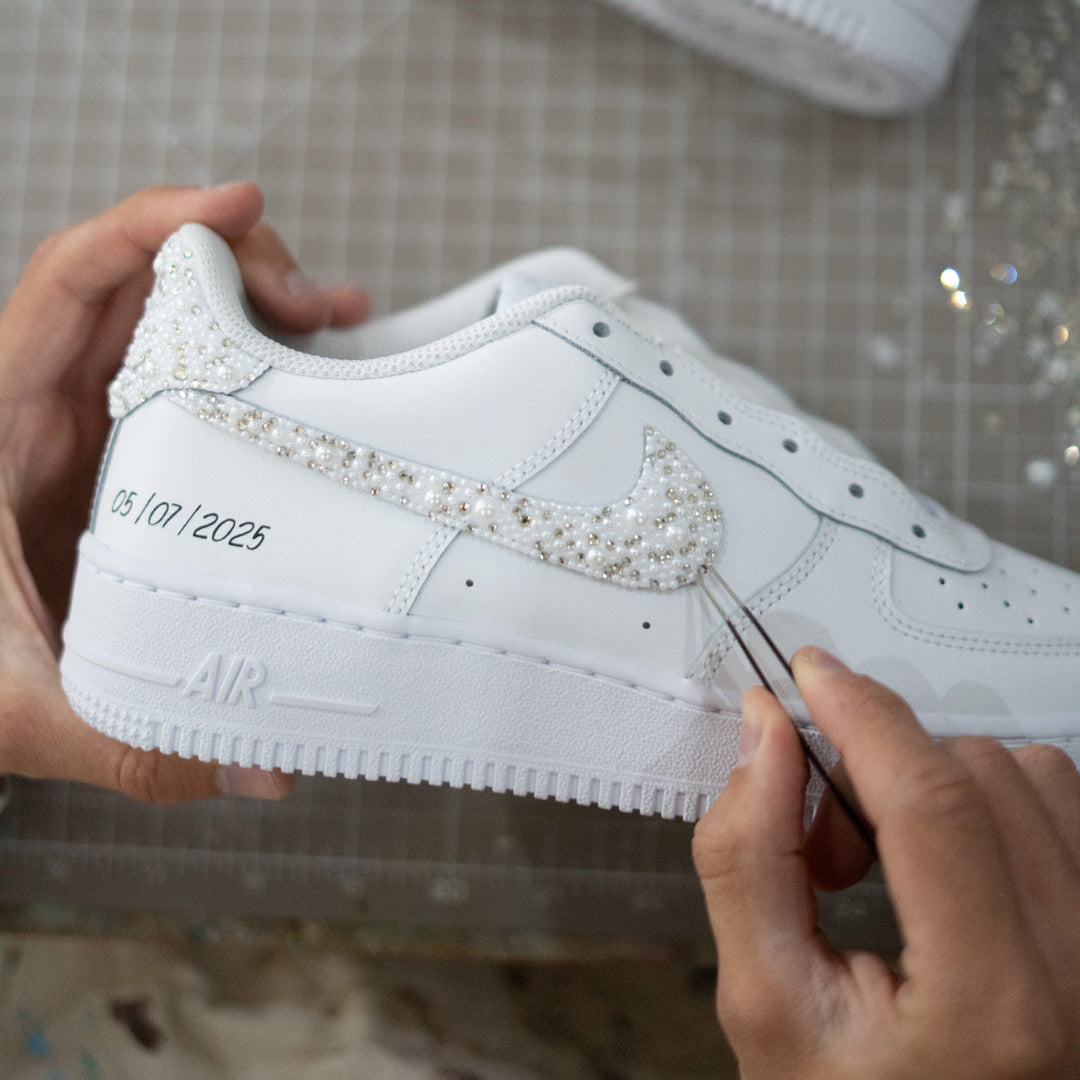 Nike Air force 1 - Bridal. All rhinestones & pearls have been hand placed onto footwear for up to 7 hours. You can choose to add hand painted details on the heel of your Air force specific to your requirements, i.e date, name. Please wear with the same care this product has been crafted with. All footwear comes with crease protectors for the toe box of your shoes.